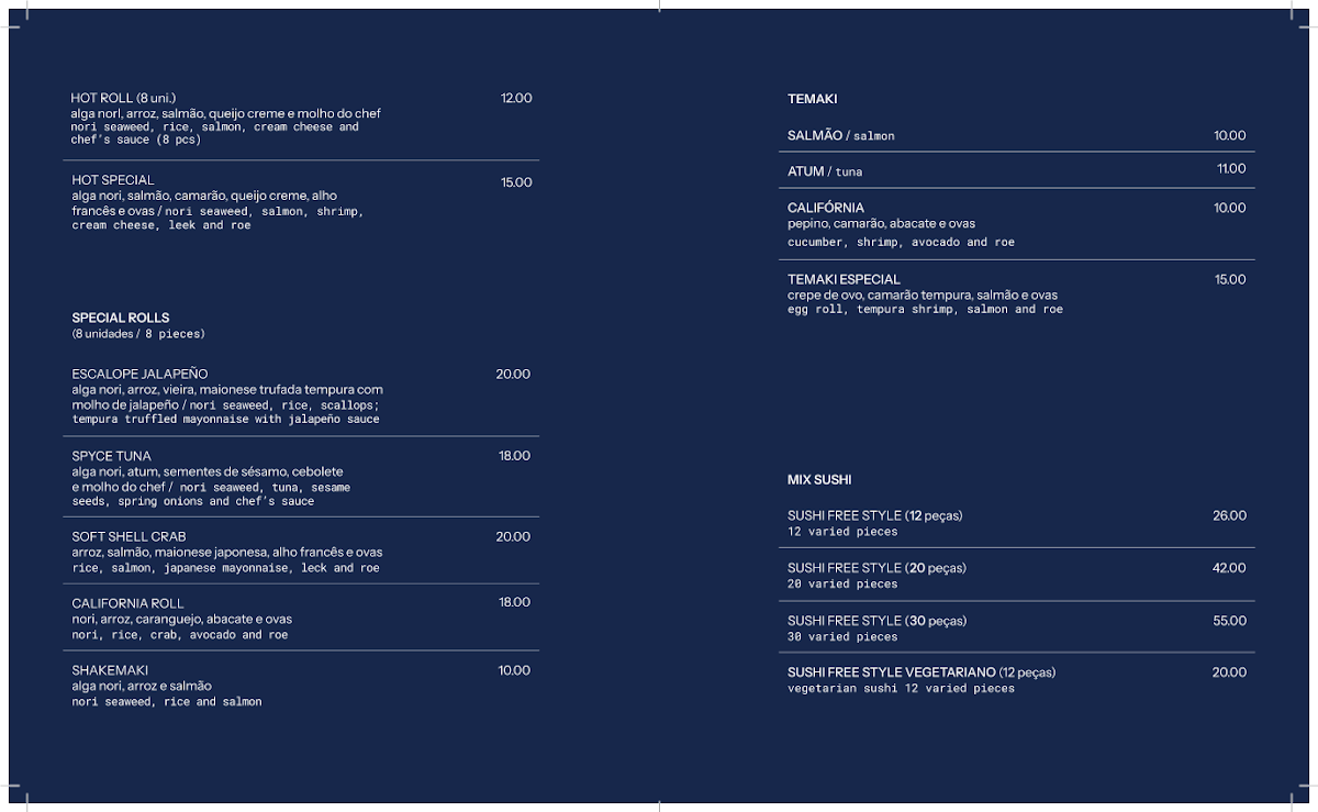 alga nori, salmão, camarão, queijo creme, alho francês e ovas/nori seaweed, salmon, shrimp, cream cheese, leek and roe